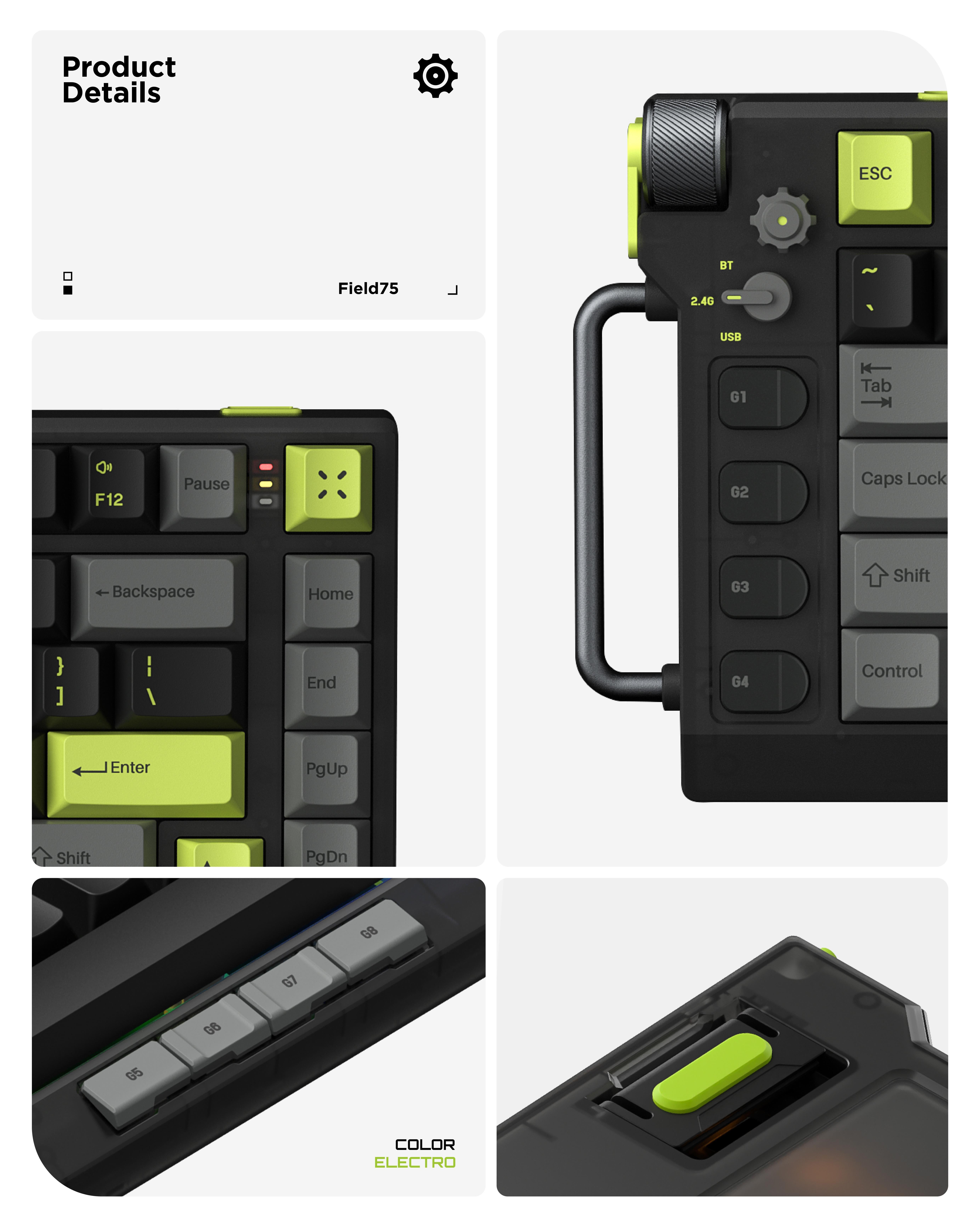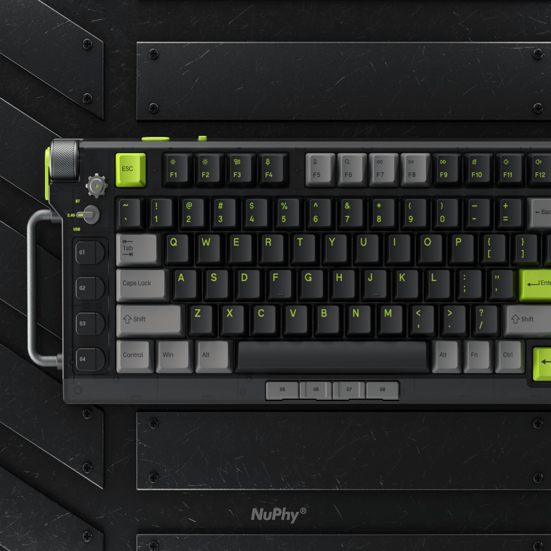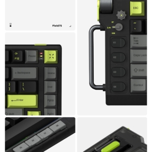 Nuphy Field75 có kích thước bố cục 75%, khiến nó nhỏ gọn nhưng vẫn đầy đủ chức năng. Nó bao gồm một tay lái bằng kim loại và một núm kim loại để điều chỉnh âm lượng, mang lại vẻ thẩm mỹ dieselpunk khác biệt. Bàn phím được trang bị viên pin 4200mAh, đảm bảo thời gian sử dụng lâu dài mà không cần phải sạc thường xuyên. Nó tuân theo tiêu chuẩn bố cục ANSI và có thể thay nóng, cho phép người dùng dễ dàng thay thế hoặc nâng cấp công tắc mà không cần hàn.
