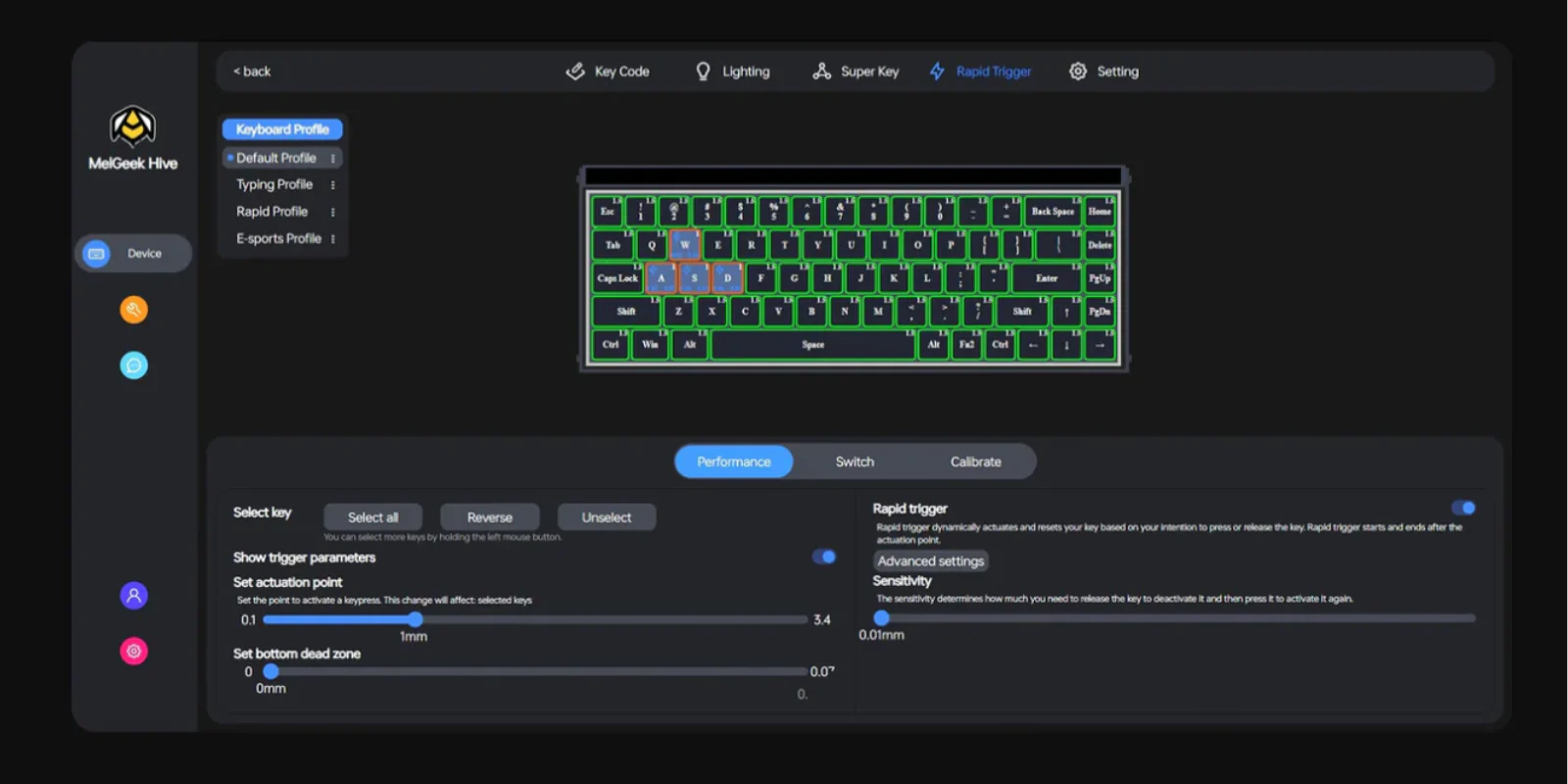 Actuation Range: 0.1mm–3.4mm (global adjustable)