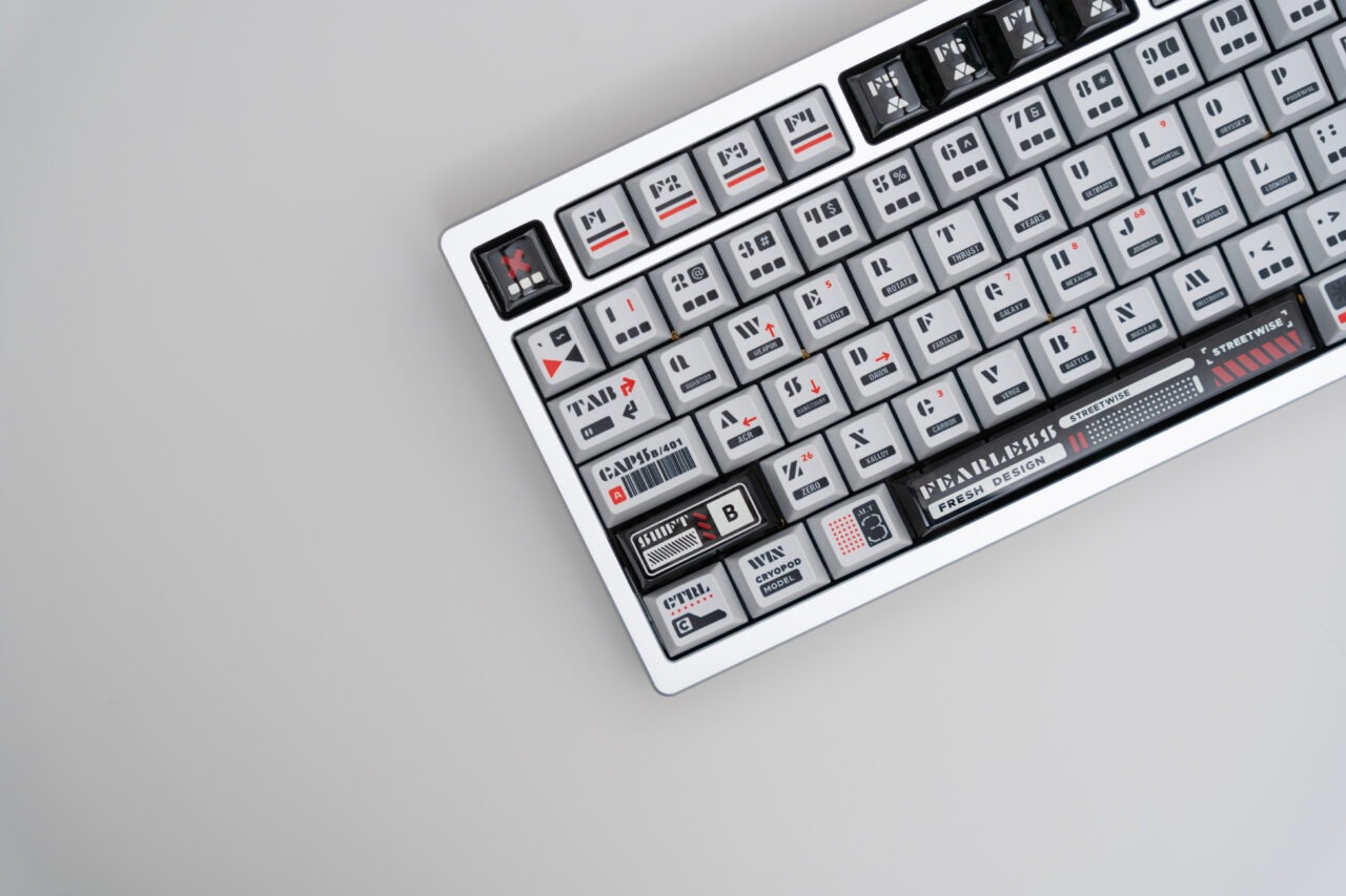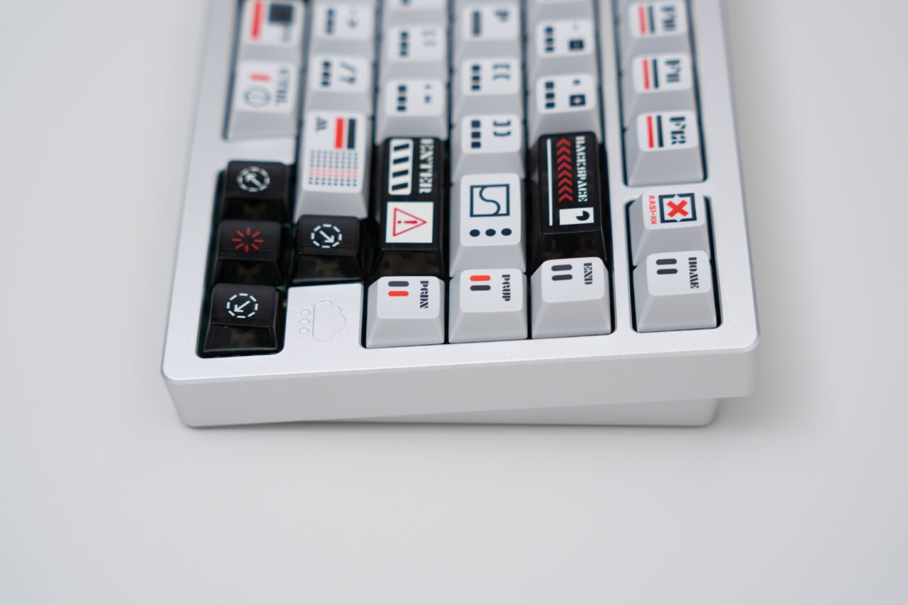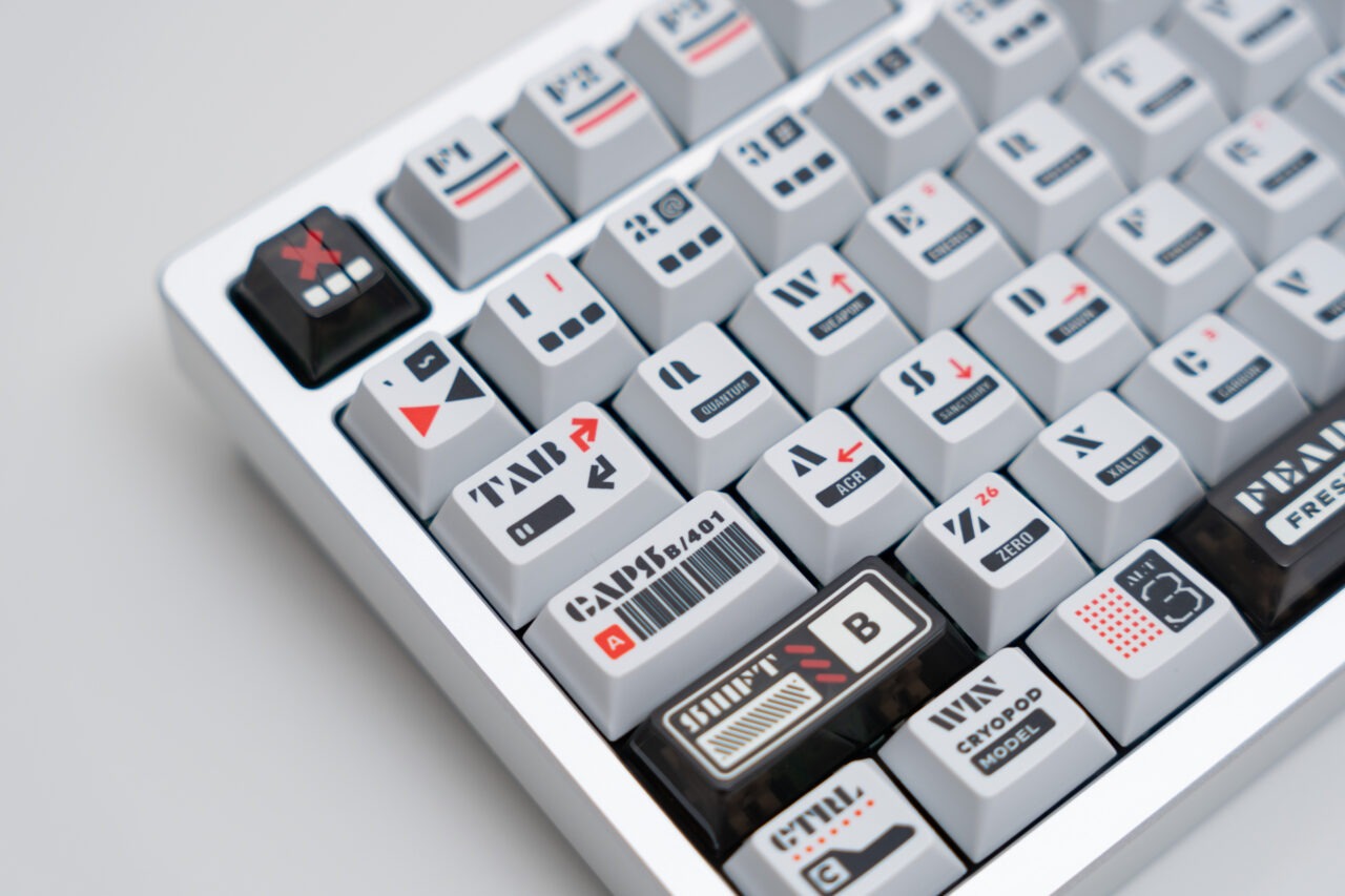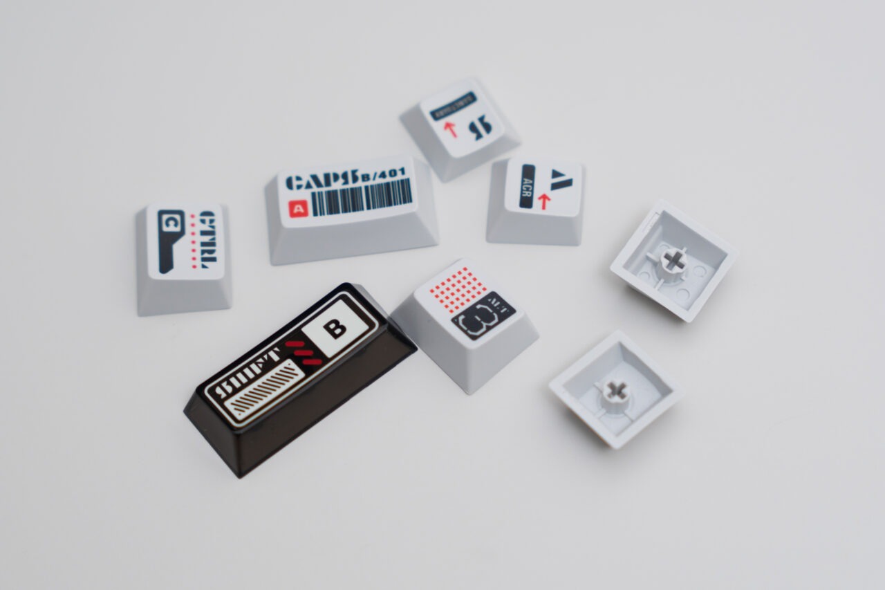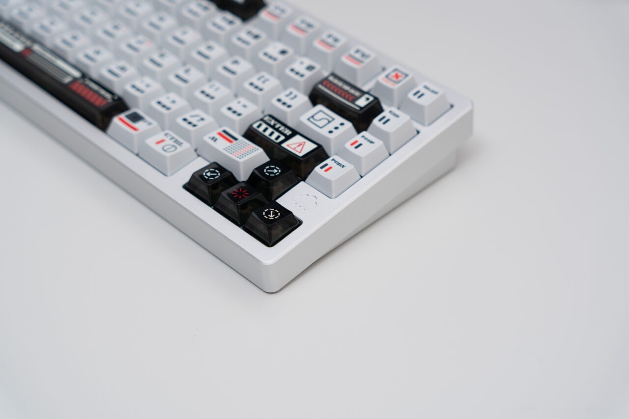 Keycaps : Double shot PBT, white on grey / Dye Sub + UV PC matching theme