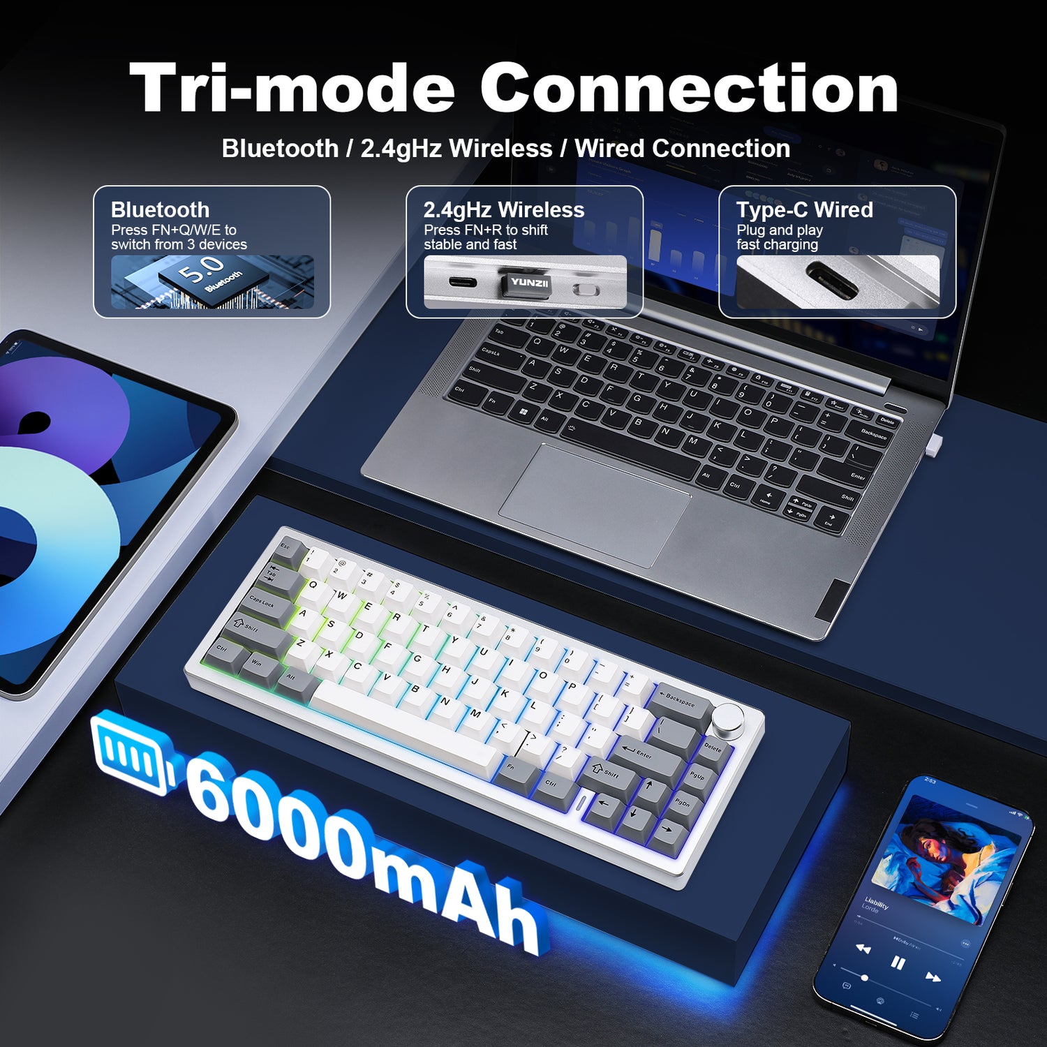 • Kết nối: Wired Type-C/Bluetooth/2.4G Wireless